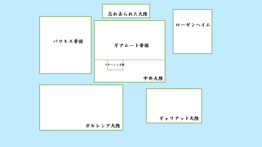 「中央大陸」としてアレンが生まれたラターシュ王国、隣国のギアムート帝国。最北の「忘れられた大陸」に「終わりの魔王」が生まれたこと。それに対抗するバウキス帝国とローゼンヘイムを含む五大陸同盟。さらには創造神エルメアが導いた勇者ヘルミオス。ヘレン村の開拓の経緯。