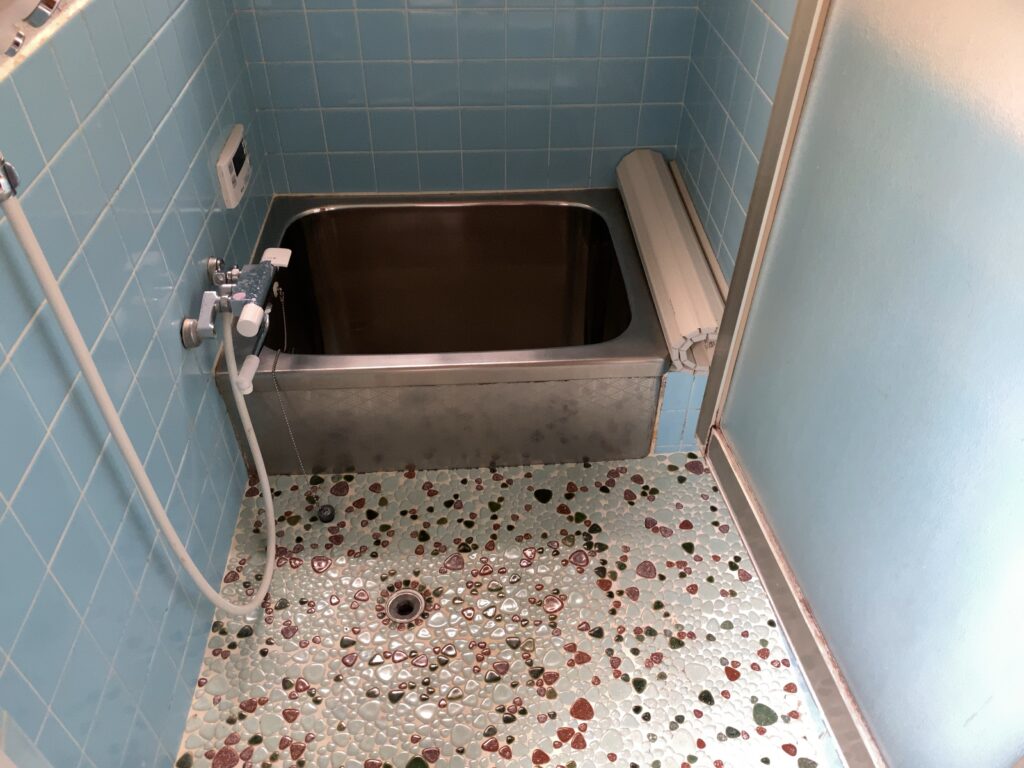 お風呂です。ここはすでに混合水栓になっているので、バスシートをタイルの上に貼ればそのまま使えそう。