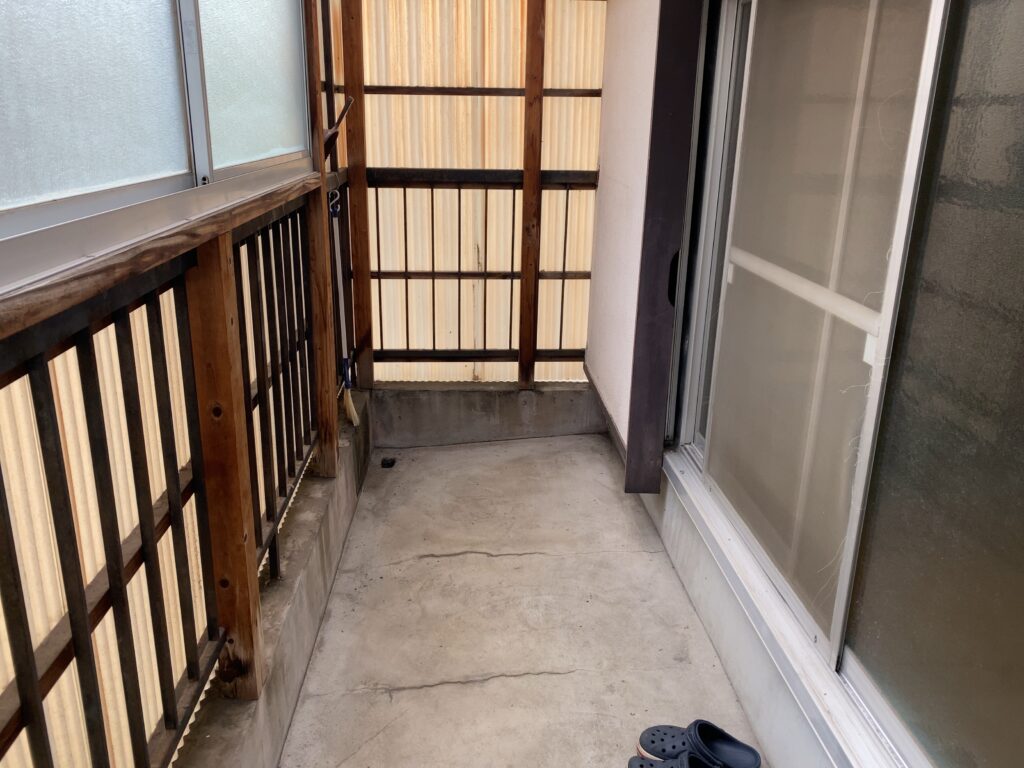 この古家、二階に洗濯機置き場があったのですが、一応そちらも使えるようにしています。ベランダがあるので、家庭菜園もできそうです。
