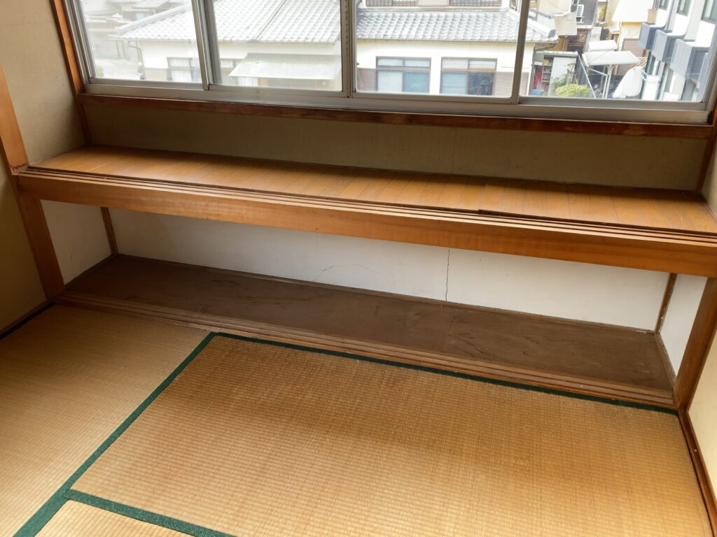 畳もキレイ、表替えだけで行けそう。この一段はなんだろう?窓からは新しいアパートが見えます。そこそこ賃貸需要がありそうな雰囲気です。