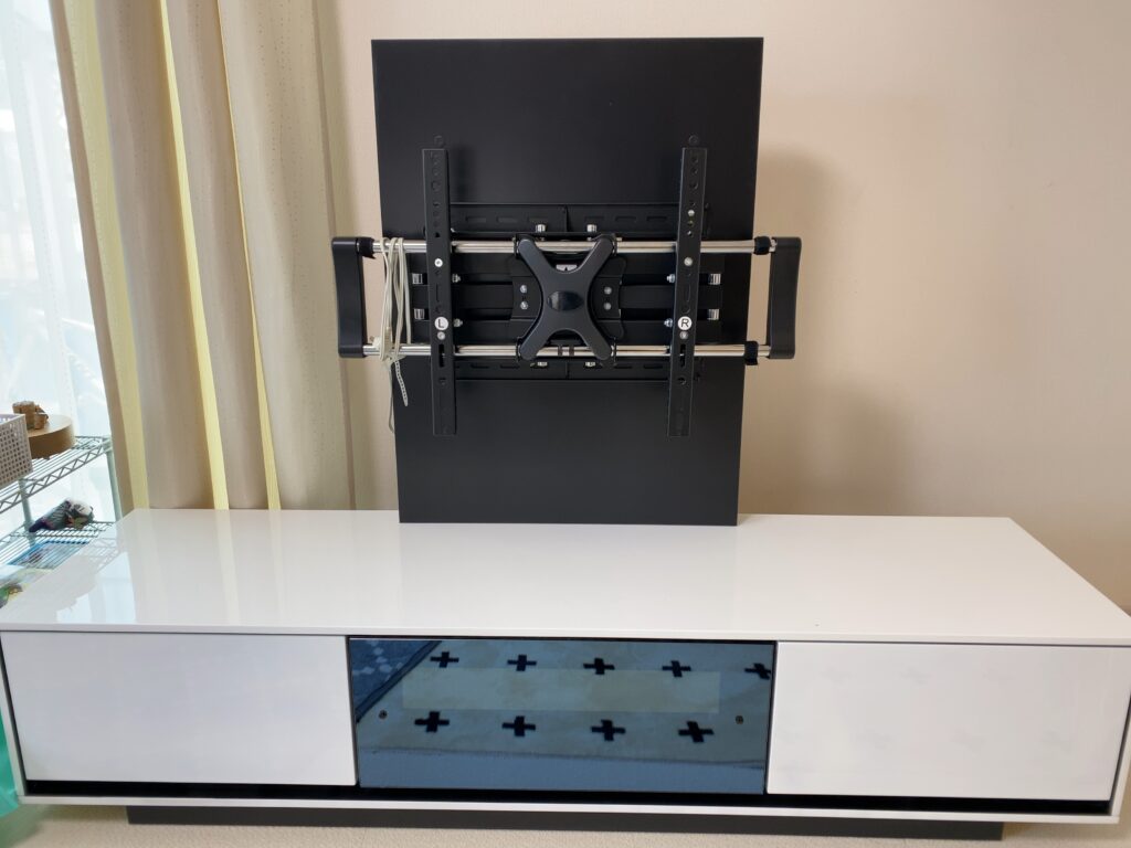 我が家はこれにローボード(LEBERO)に壁掛け風に見せれるパネルを設置しています。これがあると床に座った状態でちょっと目線が上、立った状態でちょっと目線が下ぐらいに見えるので、いい感じです。椅子に座ってみるとちょうど目線ぐらいで使い勝手がいいです。